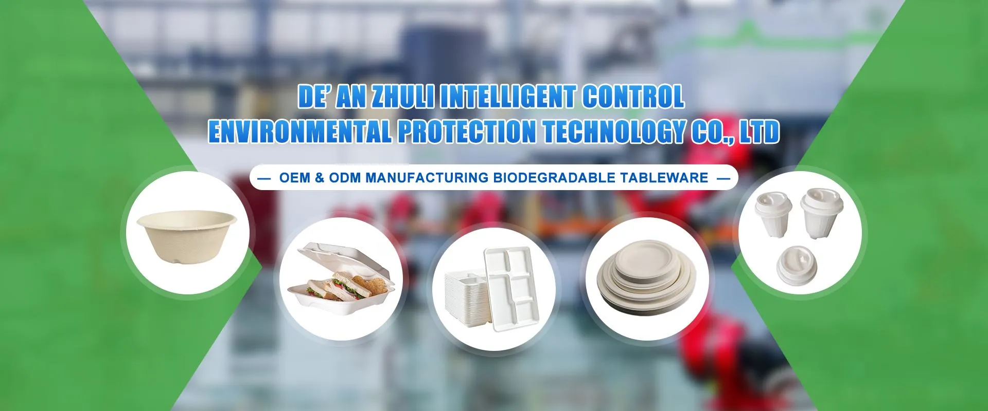 Spoločnosť De'an Zhuli Intelligent Control Environmental Protection Technology Co., Ltd bola založená v roku 2022 a nachádza sa v demonštračnom parku priemyselnej transformácie a modernizácie priemyselnej oblasti Fenglin, okres De'an, mesto Jiujiang, provincia Jiangxi a má rozlohu 20 000 metrov štvorcových. moderných dielní a kancelárskych budov s počiatočným základným imaním 100 miliónov RMB. Spoločnosť sa zaviazala k vývoju a výrobe vysokokvalitných trvalo udržateľných obalových produktov pre styk s potravinami, hlavnými produktmi sú rôzne typy nádob na potraviny, taniere, misky, podnosy, škatule, poháre, nástavce, zloženie produktov je z prirodzene pestovaných rastlinných vlákien ktorý sa môže prirodzene rozložiť za 90 dní, kompostovateľný, bez toxických chemikálií, aby boli vaše jedlá v bezpečí.